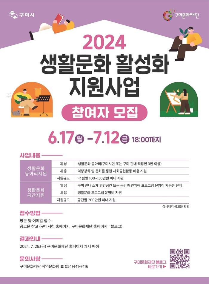 이번 공모는 ‘생활문화동아리 지원’과 ‘생활문화공간 지원’ 부문으로 나눠 진행하며, 7월12일까지 신청하면 된다.