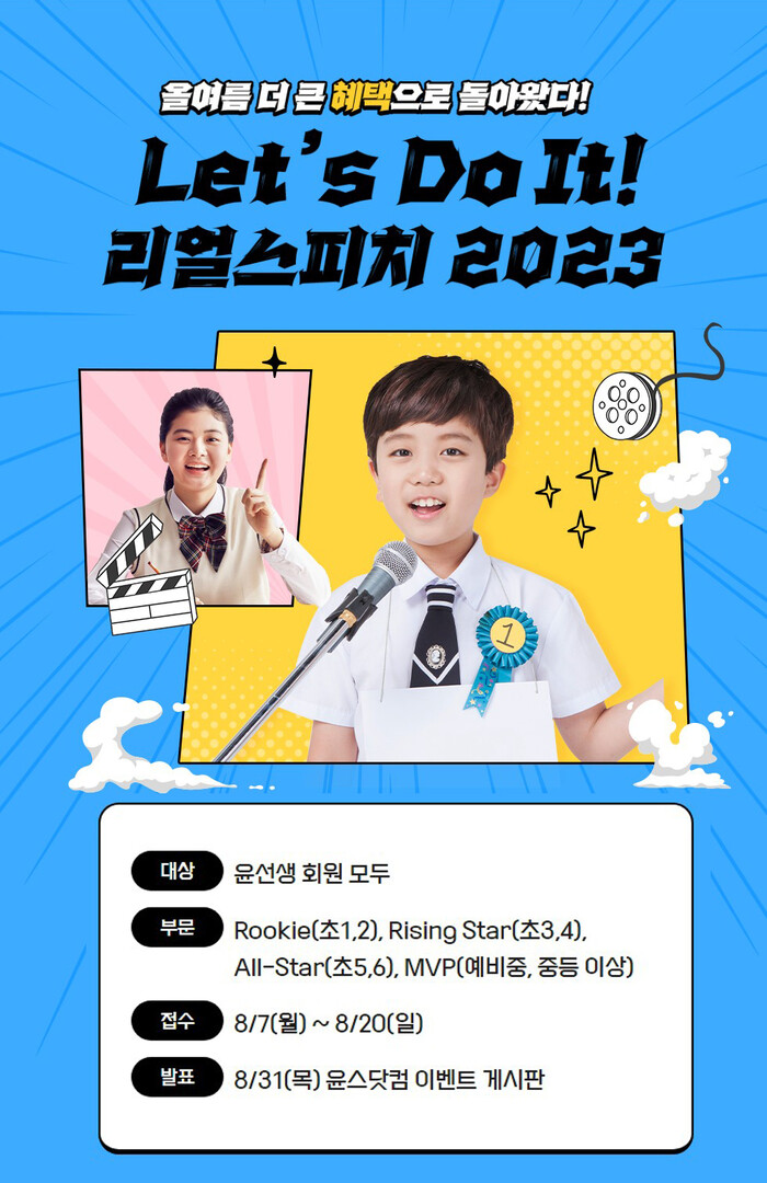 [시민일보 = 여영준 기자] 영어교육 전문기업 윤선생은 오는 7~20일 영어 말하기의 자신감을 높일 수 있는 ‘리얼스피치 콘테스트 2023’을 진행한다고 1일 밝혔다.