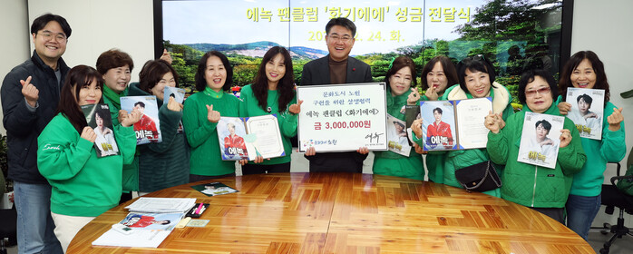 오승록 서울 노원구청장이 최근 구청장실에서 에녹 팬클럽 ‘화기에에’ 회원들을 만나 기부금 전달식을 열었다. 기부금 300만원은 문화도시 노원 구현을 위한 행사 추진에 쓰일 예정이다. 사진은 오 구청장(가운데)이 팬클럽 관계자들과 기념 촬영을 하는 모습. (사진=노원구청 제공)