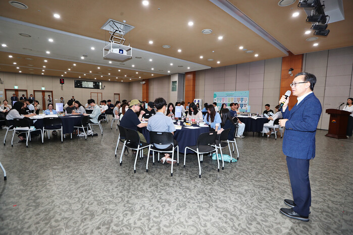 | ▲ 지난해 7월 금천구 청년정책 기본계획 수립을 위해 열린 ’금천청년 대토론회‘에서 유성훈 구청장이 인사말을 하고 있다. (사진=금천구청 제공) |