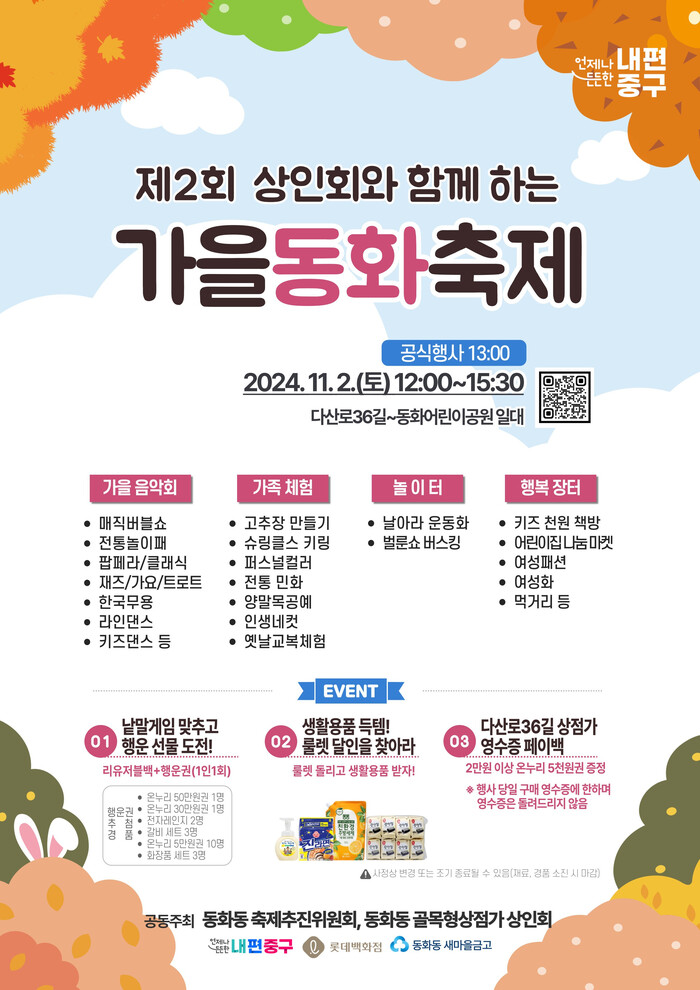 [시민일보 = 여영준 기자] 서울 중구가 오는 11월2일 낮 12시~오후 3시30분 동화동 어린이공원 일대에서 가을동화축제를 개최한다.