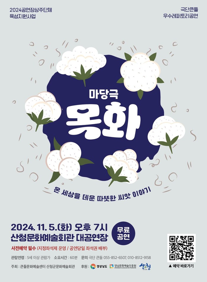 2024공연장상주단체육성지원사업 일환으로 오후 7시부터 열리는 마당극 목화는 고려 후기 문익점이 원나라에서 목화씨 열 알을 고려 땅으로 가지고 오는 것에서부터 시작한다.