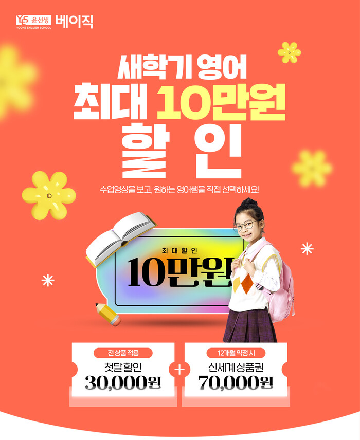 윤선생에 따르면 오는 4월30일까지 윤선생베이직에 가입한 신규 회원에게는 첫 달 영어 학습비 3만원을 할인해준다. 여기에 학습 기간 12개월 약정 시, 신세계상품권 7만원권을 사은품으로 추가 증정한다.