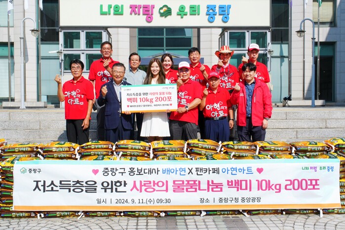 서울 중랑구가 최근 구 홍보대사 가수 배아현 및 팬카페와 성품 전달식을 진행했다. 후원 물품은 600만원 상당의 백미 10kg 200포로, 서울사회복지공동모금회에 기탁돼 지역내 저소득층에 전달된다. 사진은 전달식에서 류경기 구청장(앞줄 왼쪽 두 번째)과 홍보대사 배아현 및 팬카페 회원들이 기념촬영을 하고 있는 모습. (사진=중랑구청 제공)