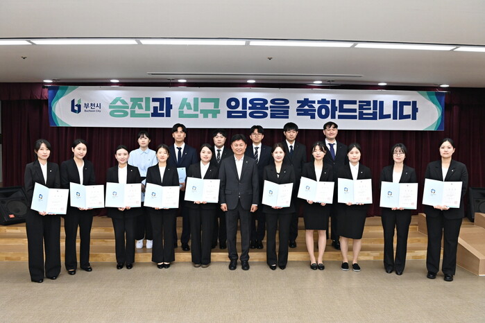 [부천=문찬식 기자] 경기 부천시는 23일 시청 소통마당에서 2025년 10월1일자 인사발령에 따른 임용장 수여식을 열고, 5급 승진자 2명(직원복지과 후생복지팀장 박미경ㆍ주차지도과 주차행정팀장 이순임)과 신규 임용자 16명에게 임용장을 전달했다.
