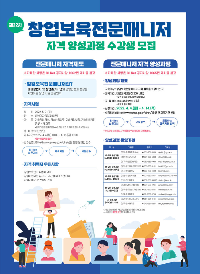 창업보육전문매니저 자격 양성과정은 예비창업자 및 창업초기 기업의 경영 안정과 성장지원을 위한 창업지원 전문 인력 양성을 배출하기 위해 마련되었으며 2022년 제 22차 창업보육전문매니저 자격시험을 준비하는 수험생의 부담을 경감시키고 우수 인력을 조기에 확보하는데 교육 목표가 있다.