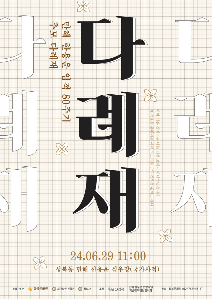 [시민일보 = 여영준 기자] 서울 성북구(구청장 이승로)는 오는 29~30일 성북문화원, 재단법인 선학원과 손잡고 ‘만해 한용운 선사 입적 80주기’를 추모하는 다양한 행사를 연다고 밝혔다.