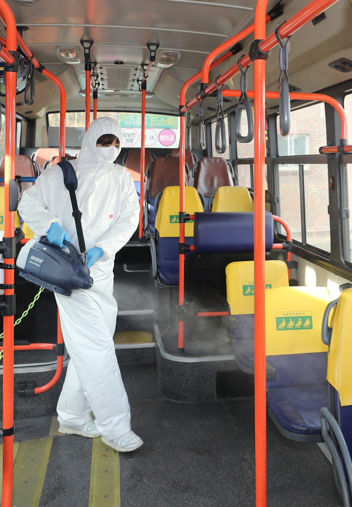 1일 오전 광주 동구 한 버스차고지에서 운행을 마친 차량에 방역소독이 이뤄지고 있다. 전날 시내버스 운전원의 코로나19 확진으로 다른 운전원들의 진단검사를 위해 일부 노선 운행이 중단되거나 감축됐다.