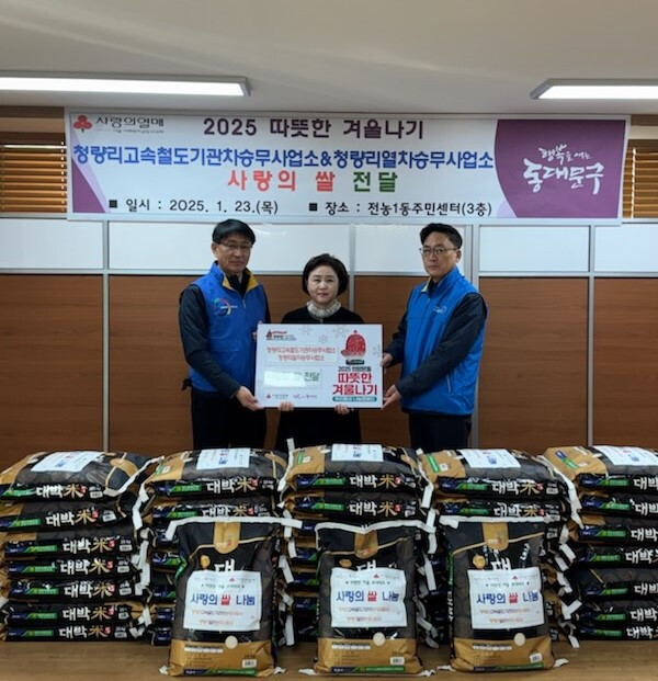 [시민일보 = 이대우 기자] 동대문구(구청장 이필형)는 최근 청량리고속철도기관차승무사업소와 청량리열차승무사업소(이하 코레일)가 200만원 상당의 백미(20kg) 38포를 전농1동주민센터에 기탁하며 ‘2025 따뜻한 겨울나기 사업’에 동참했다고 7일 밝혔다.