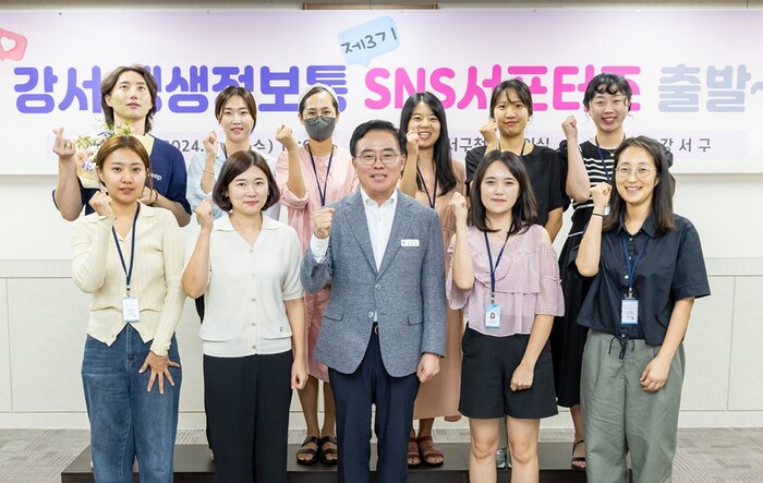 서울 강서구의 다양한 소식을 전할 ‘제3기 강서 SNS 서포터즈’가 출범했다. 선발된 인원은 총 15명으로, 개인 SNS 채널을 운영하며 활발히 활동 중인 주민들을 선발했다. 사진은 진교훈 구청장(앞줄 가운데)이 서포터즈들과 기념촬영을 하고 있는 모습.(사진=강서구청 제공)