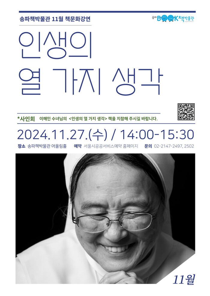 [시민일보 = 이대우 기자] 송파구(구청장 서강석)가 오는 27일 오후 2시 송파책박물관에서 시인이자 에세이 작가인 이해인 수녀를 초청, ‘책문화 강연’을 개최한다.