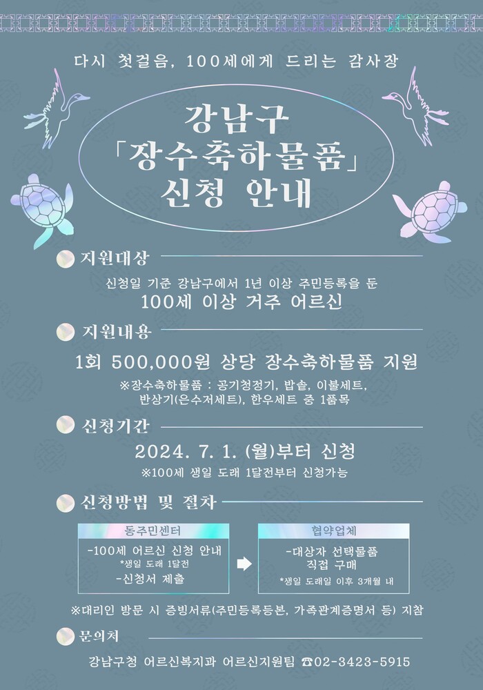 한편 구는 지난해 11월 ‘서울시 강남구 장수축하금 등 지원에 관한 조례’를 제정한 바 있다.