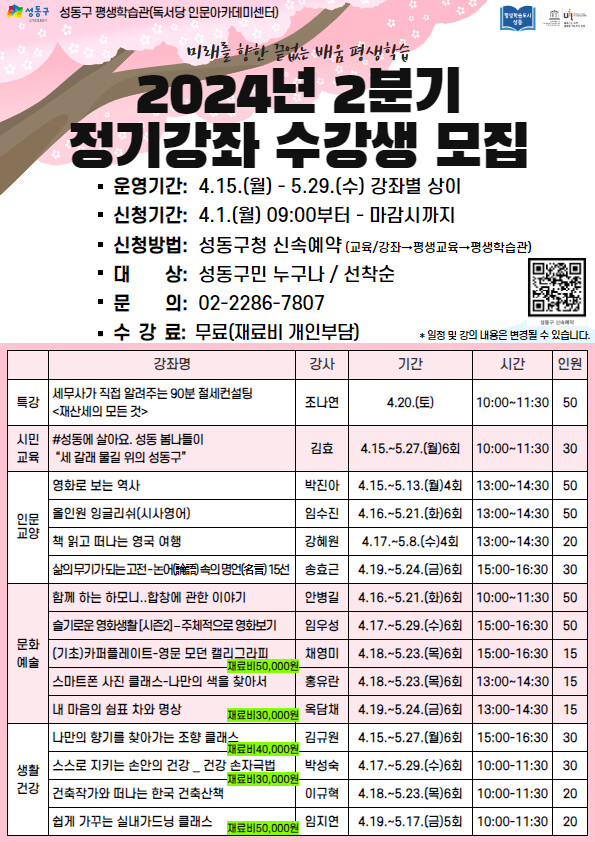 [시민일보 = 이대우 기자] 서울 성동구(구청장 정원오)가 오는 4월1일부터 성동구 평생학습관의 2분기 정기강좌 수강생을 모집한다.