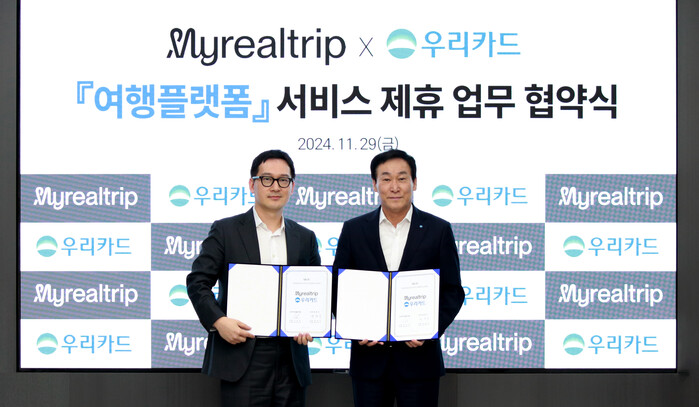 지난 11월29일 우리카드 광화문 본사에서 진행된 행사에는 박완식 우리카드 대표이사와 이동건 마이리얼트립 대표이사 등이 참석해 양 사 간 상호 협력을 약속했다.