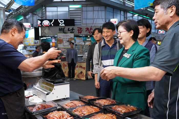 이순희 서울 강북구청장은 추석 명절을 앞두고 지역경제와 민생 현장을 직접 살피기 위해 29일부터 지역내 전통시장 11곳과 골목형상점가 5곳을 순회하고 있다. 사진은 전통시장에 방문한 이순희 구청장(오른쪽 두 번째)이 상인들과 소통하고 있는 모습. (사진=강북구청 제공)