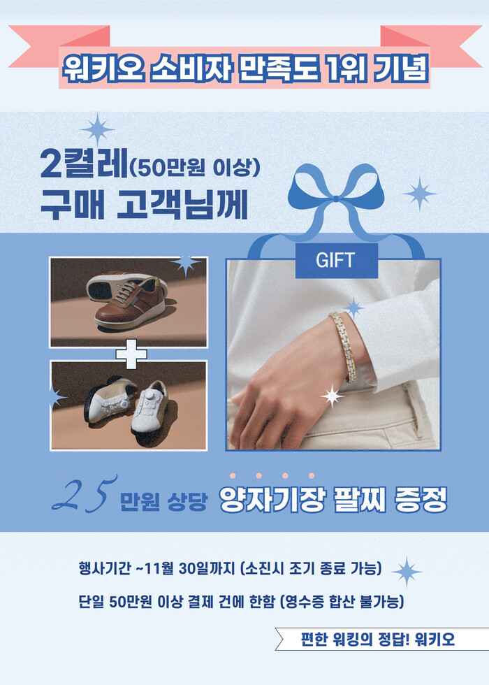 이번 프로모션은 소비자만족도 2년 연속 1위 수상 기념과 민생회복쿠폰 캠페인을 지원하는 일환으로, 1인 2켤레 이상(50만 원 이상) 단일 결제 고객에게 소비자가 25만 원 상당의 양자기장팔찌 1개를 무상 증정하는 내용이다.