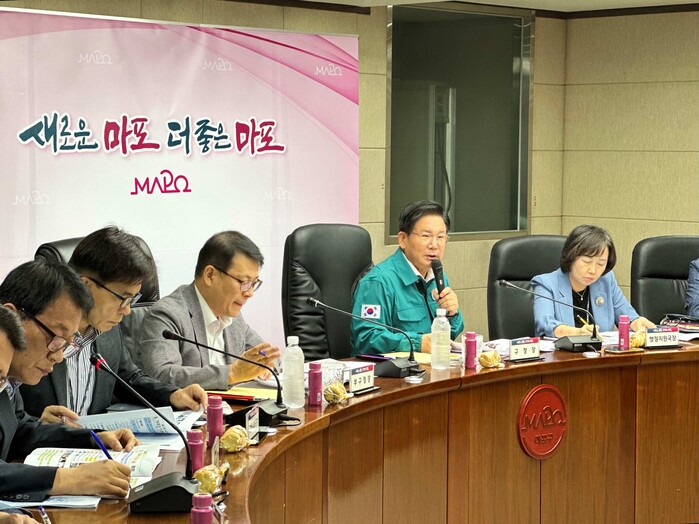 | ▲ 9월 확대간부회의에서 박강수 구청장이 간부단과 예산절감 방안을 논의하고 있다. (사진=마포구청 제공) |