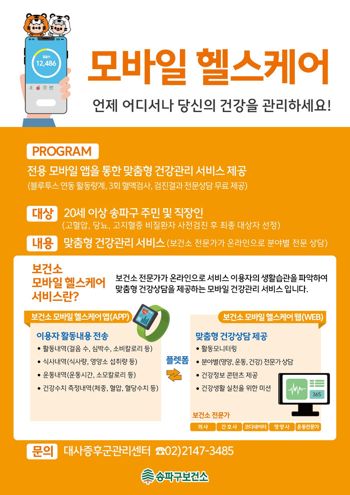 [시민일보 = 이대우 기자] 송파구(구청장 서강석)가 오는 4월까지 비대면 건강관리 서비스 ‘모바일 헬스케어사업’ 참여자 2백 명을 모집한다고 알렸다.