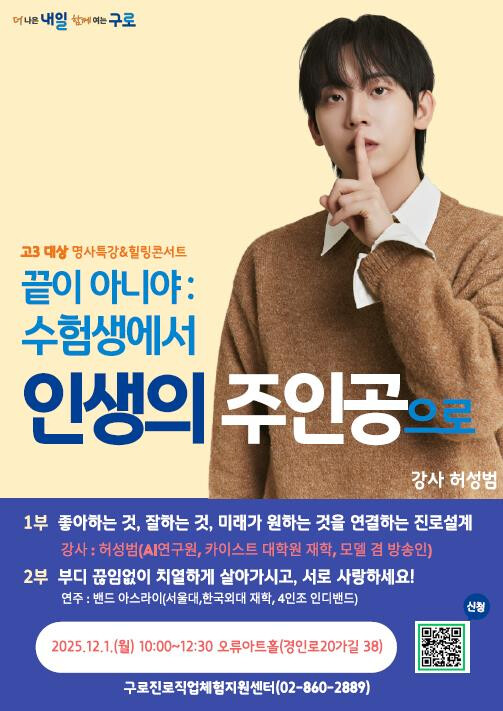 [시민일보 = 박소진 기자] 구로구(구청장 장인홍)가 올해 처음으로 수능을 마친 고등학교 3학년을 위한 ‘고3 전환기 프로그램’을 운영한다. 행사는 12월 1일 오류아트홀에서 열리며, 관내 고등학교 3학년 학생 350명이 참여할 예정이다.
