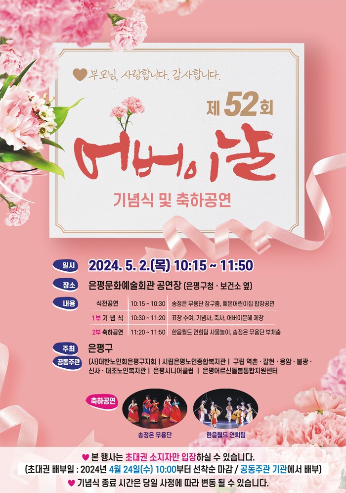 [시민일보 = 이대우 기자] 서울 은평구(구청장 김미경)가 오는 5월2일 은평문화예술회관 공연장에서 지역 노인 700여명을 대상으로 ‘제52회 어버이날 기념행사’를 개최한다.