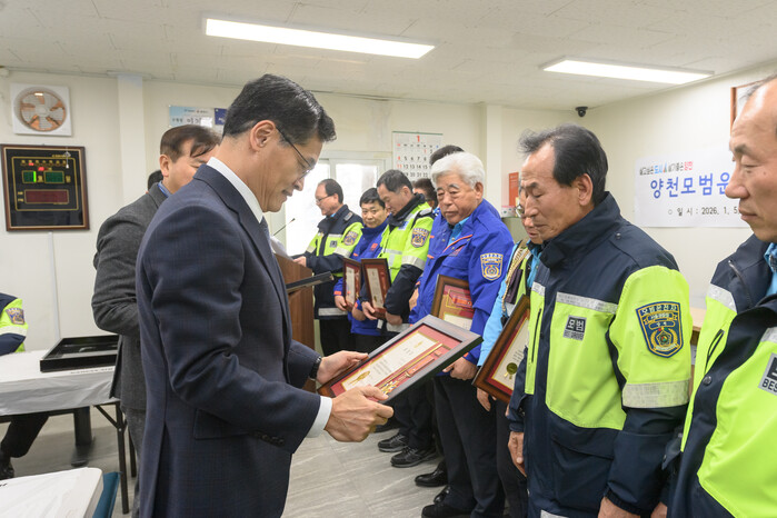 이기재 서울 양천구청장이 최근 '양천 모범운전자회 우수회원 표창장 수여식'에 참석해 교통안전과 지역사회 발전에 기여한 모범운전자회 회원들을 격려했다. 사진은 이 구청장(왼쪽)이 모범운전자회 우수회원들에게 표창장을 전달하는 모습. (사진=양천구청 제공)