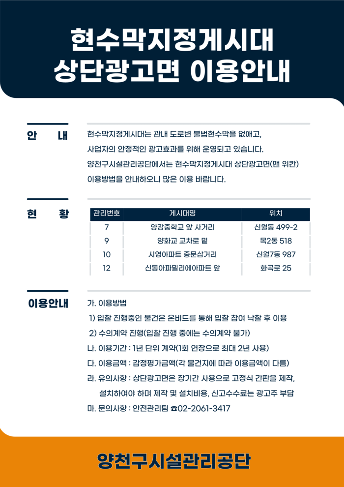 [시민일보 = 박소진 기자] 양천구시설관리공단은 현수막 지정 게시대 상단 광고면에 대해 이용 방법 안내 및 광고주의 문의를 기다린다고 밝혔다.