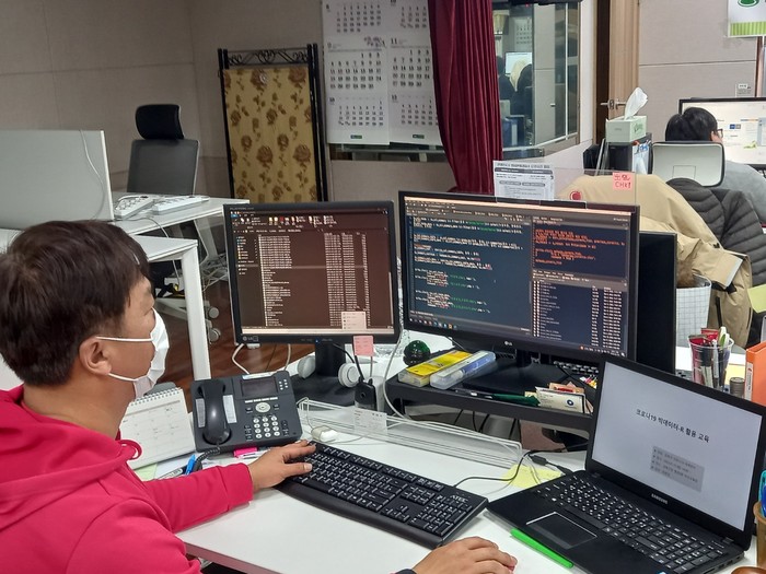 | ▲ 프로그램 개발자인 최광일 주무관이 빅데이터 분석 프로그램을 통해 재감염자를 추출하고 있는 모습. (사진=강북구청 제공) |