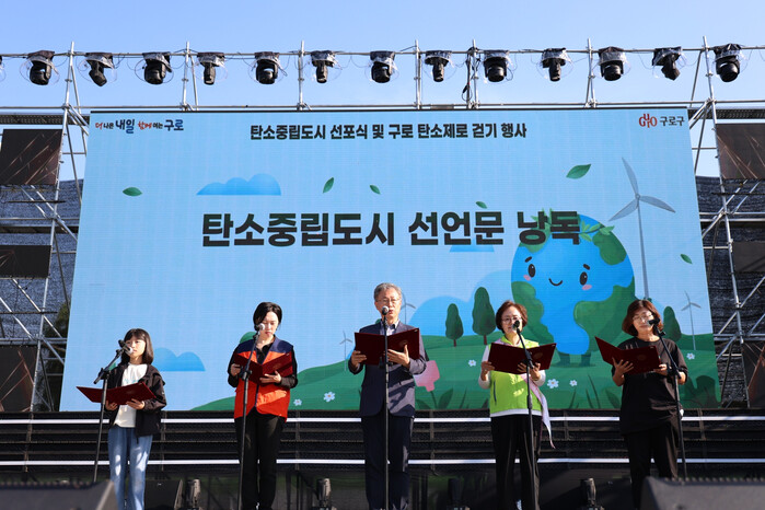 서울 구로구가 최근 안양천 일대에서 구로G페스티벌을 개최했다. 이날 행사는 구로책축제, 탄소중립도시 선포식 및 탄소제로 걷기 행사, 구로가든페스타 등으로 마련됐다. 사진은 장인홍 구청장(가운데)과 참가자들이 ‘탄소중립도시 선언문’을 낭독하는 모습. (사진=구로구청 제공)