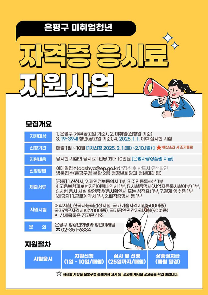 응시료 지원은 선착순으로 선정돼 지급되며 예산 소진 시 조기 종료된다. 지원을 희망하는 청년은 신청 기간 내에 포스터에 기재된 이메일로 온라인 신청하거나 은평구청 청정장년희망과로 방문하면 된다.