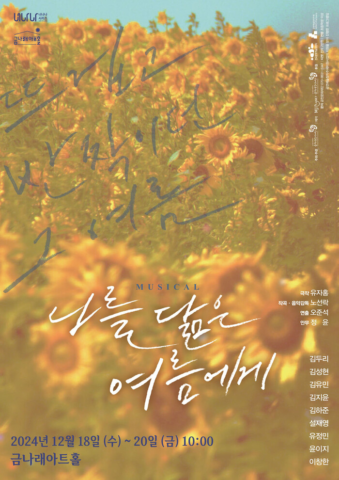 [시민일보 = 여영준 기자] 서울 금천구(구청장 유성훈)는 오는 18~20일 3일간 금나래아트홀에서 창작 뮤지컬 ‘나를 닮은 여름에게’를 선보인다고 밝혔다.