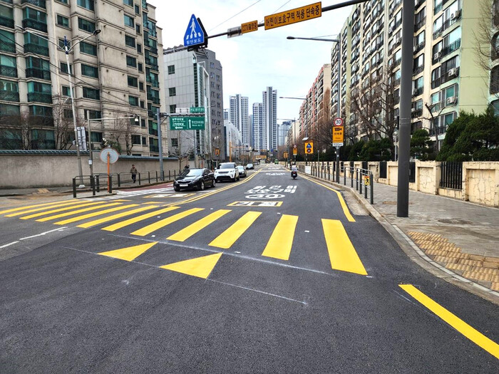 먼저 구는 통학 시간대에 차량과 보행 동선이 집중되는 점을 고려해 청담고 정문 일대 교통운영 체계를 정비했다. 반원초와 청담고 사이부터 반포3동 주민센터 삼거리 구간(신반포로23길)은 기존 2차로에서 4차로로 확장해 교통 흐름이 원활하도록 하고, 학교 주차장 출입구 앞에는 기존 중앙선을 일부 삭선하며 좌회전 표시와 정지선 등 노면표시를 신설해 안전한 운행이 가능해지도록 조치했다.