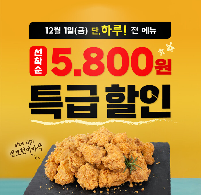 이번 바른데이는 12월 1일(금) 진행되며, 자사앱을 통해 혜택을 받을 수 있다. 바른치킨앱을 접속한 후 인근 매장에 들어가 상단에 노출된 5,800원 할인쿠폰을 다운받으면 된다. 다운받은 쿠폰은 결제 과정에서 적용할 수 있으며 방문포장 주문 시에만 할인받을 수 있다.