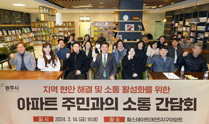 경기 광주시가 최근 주민과의 소통을 강화하고 지역 현안을 논의하기 위해 힐스테이트 태전5지구 아파트 내 북카페에서 주민 소통 간담회를 개최했다. 사진은 간담회에서 방세환 시장(가운데)이 참여자들과 기념 촬영을 하는 모습. (사진=광주시청 제공)
