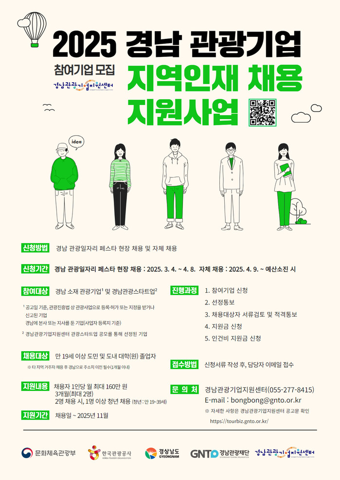 채용은 두 단계로 진행된다. 먼저 3월4일부터 이달 8일까지 ‘2025 경남 관광일자리 페스타’ 참여기업을 모집하고 현장 채용을 진행했다.
