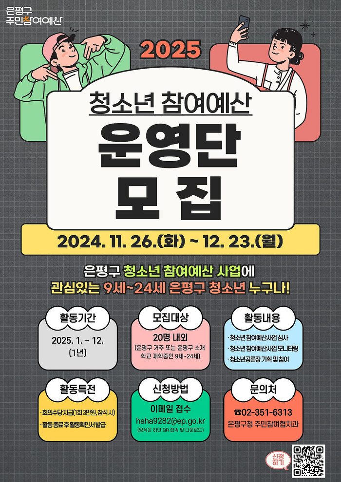 지원을 희망하는 청소년은 은평구청 누리집 고시‧공고를 확인하거나 모집 포스터의 큐알(QR) 코드에 접속해 신청서를 작성 후 전자메일로 제출 또는 직접 방문해 제출하면 된다.