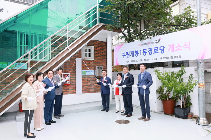 서울 구로구가 구립 개봉1동 경로당 리모델링 공사를 완료하고 5일 개소식을 개최했다. 개봉1동 경로당은 주민 안전과 편의 증진을 위해 구조보강 등 건물 내·외부 공사를 진행했다. 사진은 개소식에서 문헌일 구청장(오른쪽 네번째)이 제막식을 진행되고 있는 모습.(사진=구로구청 제공)