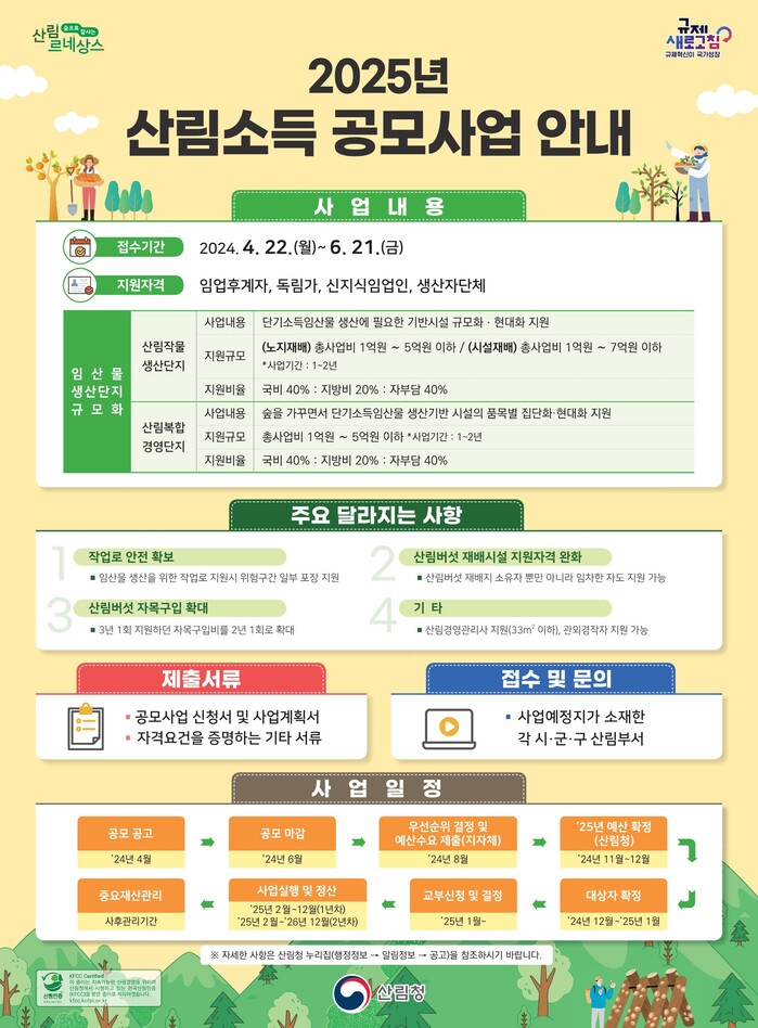효율적인 임업 경영을 위한 산림소득 공모사업에는 ‘산림작물생산단지 사업’과 ‘복합경영단지 사업’이 있으며, 버섯, 산나물, 약초류 등 단기소득 임산물을 2년 이상 재배 중인 임업후계자ㆍ독림가ㆍ신지식임업인ㆍ생산자 단체 등을 대상으로 한다.