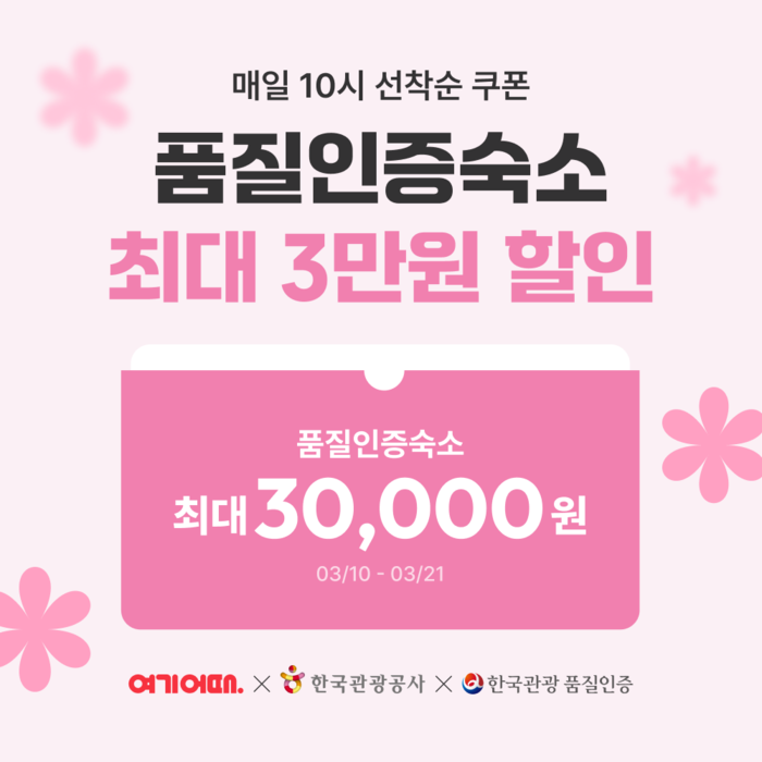여기어때는 품질인증숙소와 인증 이력이 있는 숙소 231개를 대상으로 행사를 진행한다. 7만원 이상 숙박 상품 예약시 3만원을, 7만원 미만 숙소 예약시 2만원을 할인한다. 해당 이벤트는 다른 혜택과 중복 적용이 가능해, 국내 여행객의 숙박 할인율을 크게 높인다.