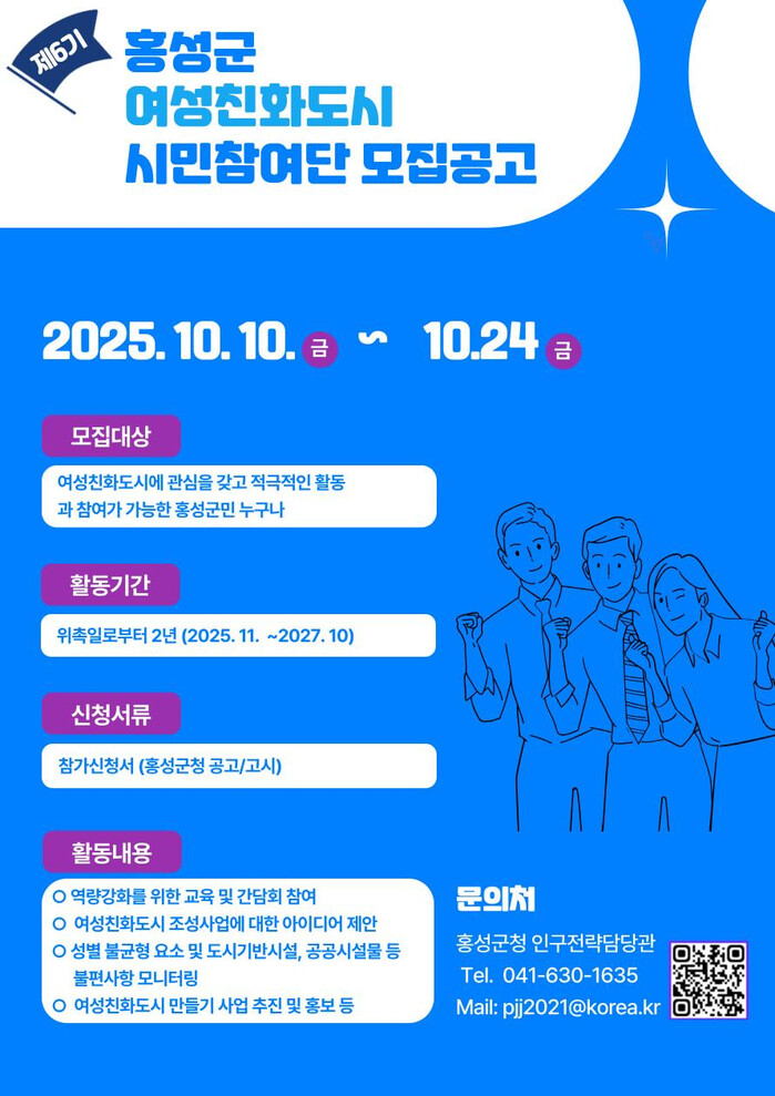 이번 모집은 남녀가 동등하게 지역 정책에 참여하여 혜택이 고루 돌아가며, 여성의 역량 강화와 돌봄ㆍ안전이 보장되는 홍성을 만들기 위한 노력의 일환으로, 시민참여단은 군민들의 다양한 의견을 정책에 반영하고, 양성평등 실현을 위한 비전을 함께 실천하는 역할을 맡게 된다.