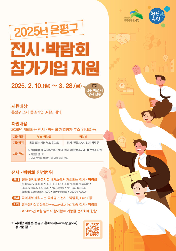 김미경 은평구청장은 “이번 지원을 통해 관내 중소기업들이 전시·박람회에 적극적으로 참여하고 더 많은 기회를 얻을 수 있길 바란다”며 “앞으로도 관내 기업들의 경쟁력 강화를 위한 다양한 정책을 마련해 나가겠다”고 말했다.