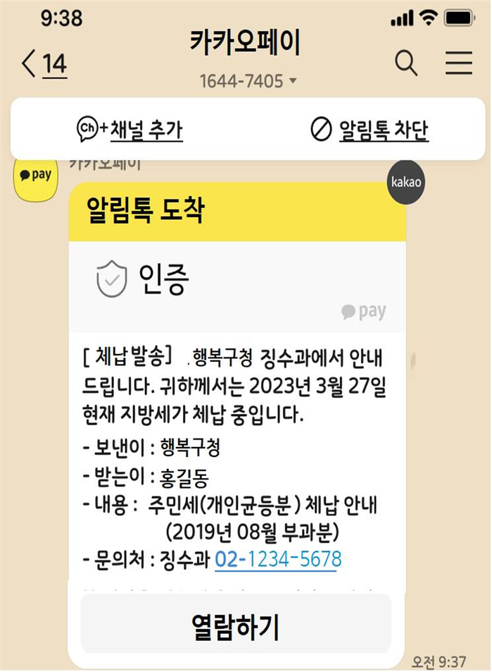알림톡을 받은 주민은 카카오페이로 본인인증 후 체납내역을 확인해 볼 수 있다.