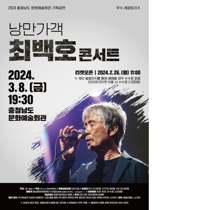 2024 충청남도 문화예술회관 세 번째 기획공연 '낭만가객 최백호 콘서트'는 특유의 허스키한 음색과 담백하고 감성적인 노래로 모든 세대에게 위로를 선물하는 가수 최백호의 1977년 데뷔곡 ‘내마음 갈곳을 잃어’부터 ‘영일만 친구', '그쟈', '입영전야', '낭만에 대하여' 등 인기곡을 비롯한 여러 발표곡으로 구성될 예정이다.