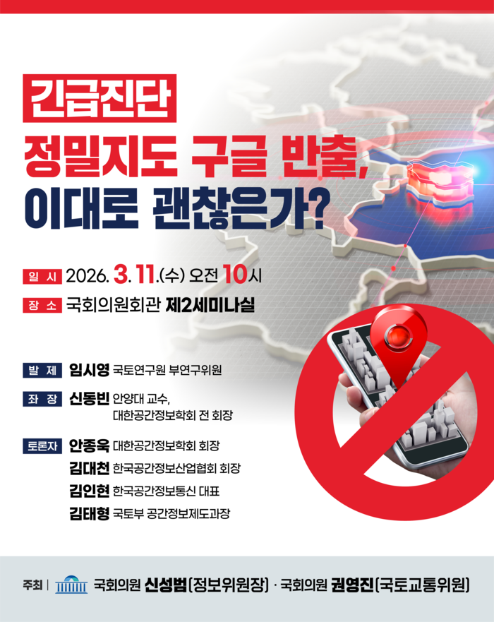 신성범 의원은 “ 지난 2007 년 이후 국가 안보상 이유로 2 차례 반려됐던 구글에 대한 정밀지도 반출 신청이 최근 미 행정부의 비관세 장벽 주장과 맞물려 새로운 국면을 맞았다 ” 며 , “ 이번 긴급진단 토론회는 정부의 정밀지도 반출 허가 결정 이후 구글의 국가안보 관련 보안자료 처리 , 국내서버 활용 계획에 대한 심사 강화 방안 등 실제 반출 전까지 반드시 선결되어야 할 과제들을 집중 점검하는 자리가 될 것 ” 이라고 밝혔다 .