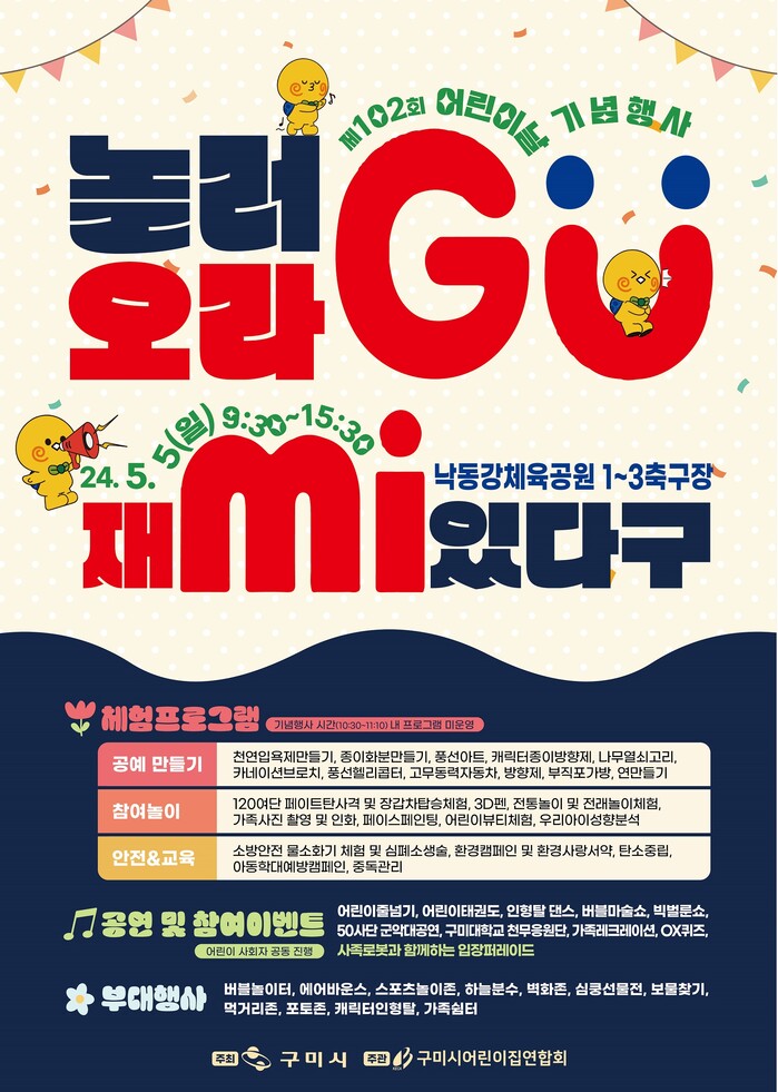 시가 주최하고 구미시어린이집연합회에서 주관하는 이번 행사는 오전 10시 축하 공연을 시작으로 아동권리헌장 낭독, 모범어린이 시상, 공연, 체험 순으로 진행되며, 공모로 선발된 어린이 사회자가 기념식 무대를 공동으로 진행해 어린이날 지정의 의미를 더하고 참여한 아동과 부모에게는 색다른 재미를 선사할 예정이다.