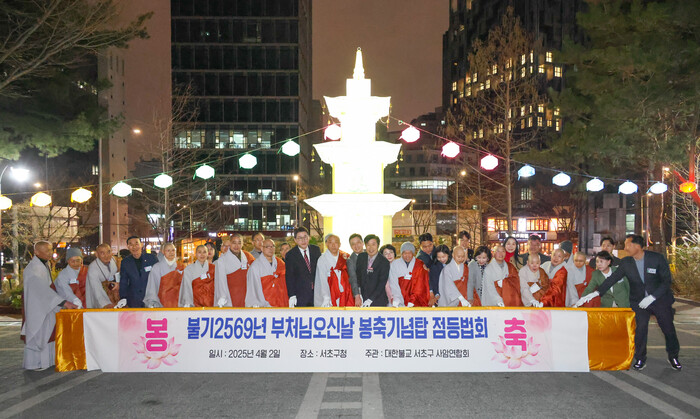 서울 서초구가 최근 불기 2569년 부처님 오신 날(5월5일)을 맞아 서초구청 광장에서 ‘봉축탑 점등법회’를 개최했다. 사진은 전성수 구청장(가운데 오른쪽)이 점등식에서 단체 기념 촬영을 하는 모습. (사진=서초구청 제공)
