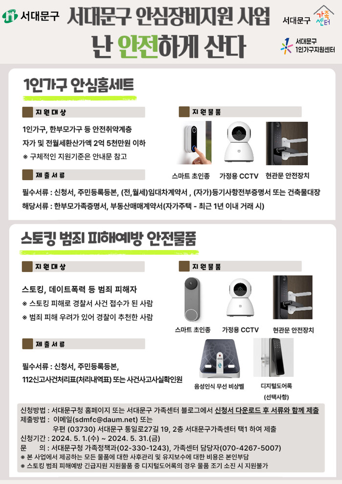 올해는 ‘서대문구 가족센터’와 함께 ‘1인가구 안심홈세트 지원사업’과 ‘스토킹 범죄 피해예방 안전물품 지원사업’을 추진한다.