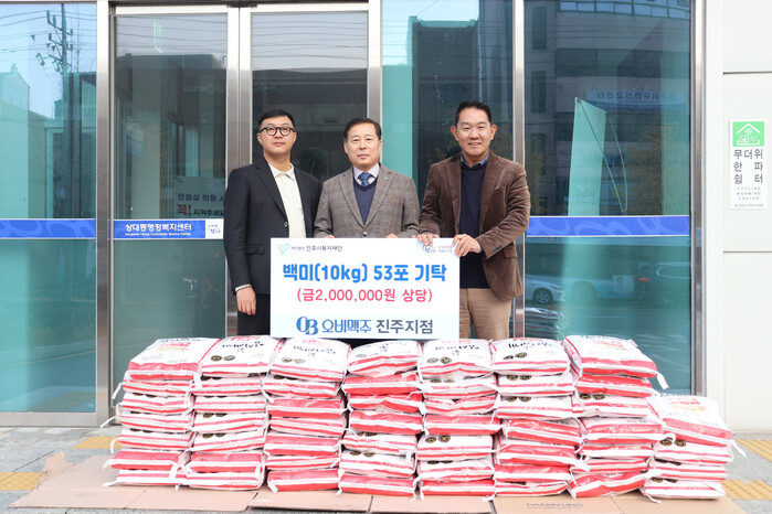 ㈜오비맥주 진주지점(지점장 김주현)은 25일, 지역사회 소외된 이웃에게 전달해 달라며 진주시복지재단(이사장 이성갑)을 방문해 백미 10kg 53포(환가액 약 200만 원 상당)를 기탁했다.