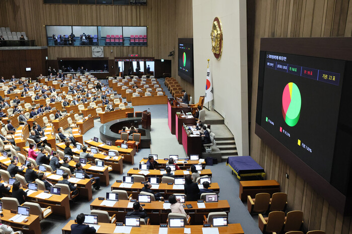 이날 무기명 비밀투표로 진행된 가운데 재석 281명 중 찬성 160명, 반대 99명, 기권 22명으로 통과됐다.