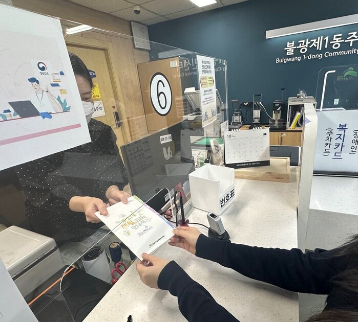 | ▲ 불광1동 생활안내서 배부 모습. (사진=은평구청 제공) |