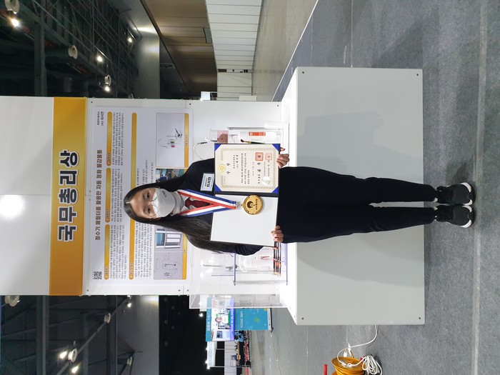 국무총리상을 받은 최서연(통영여자중, 2학년) 학생은 ‘정수기 필터를 활용한 자동 정화 물감 물통’을 만들었다.